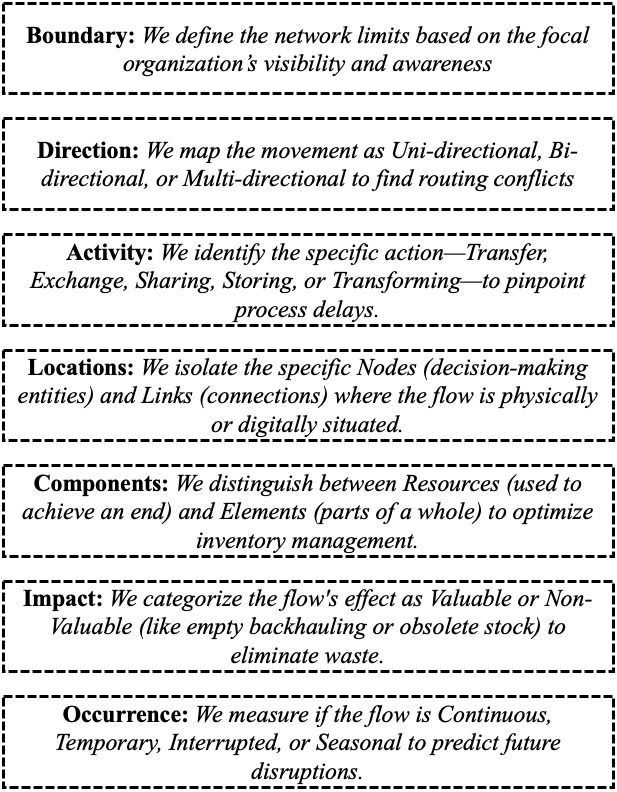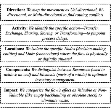 Using our proprietary framework, we mapped a major carrier’s network across seven essential dimensions to move beyond a simplistic view of logistics. By identifying "hidden" flows—specifically Human Capital (pilots and mechanics) and Capital Equipment (ground support and trucks)—we provided a 360-degree view of their true operational resilience.